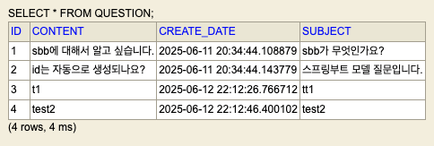 QuestionService의 create 메서드를 호출하여 질문 데이터(subject, content)를 저장